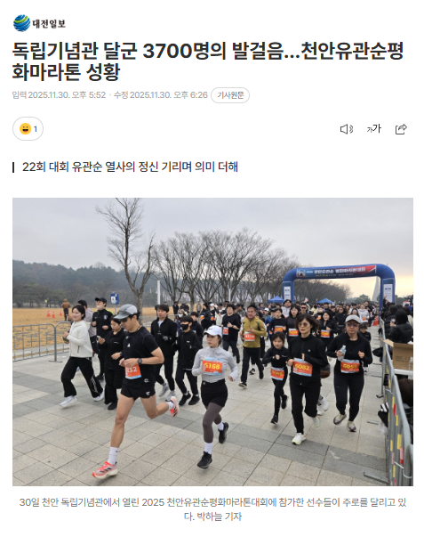'2025 천안유관순평화마라톤'이 독립기념관 목천읍 일원에서 개최됐다. 천안시육상연맹이 주최하고 대전일보가 공동 주관한 이 대회는 올해 22회를 맞는 충남의 대표 마라톤대회다. 유관순 열사의 항일 정신을 기리는 대회의 의미와 독립기념관을 배경으로 한 아름다운 코스로 유명해 전국 마라톤 동호인들의 꾸준한 사랑을 받고 있다.